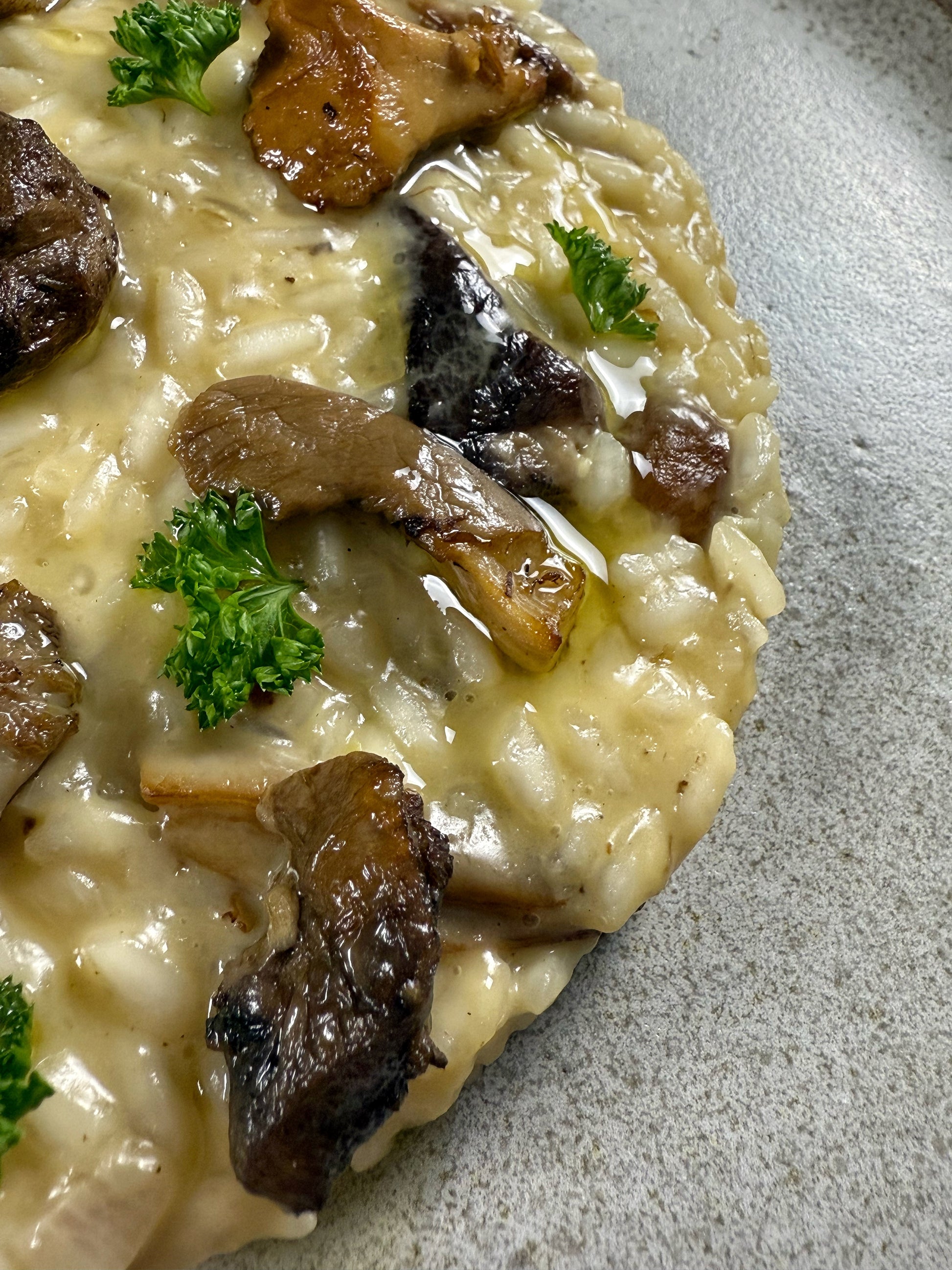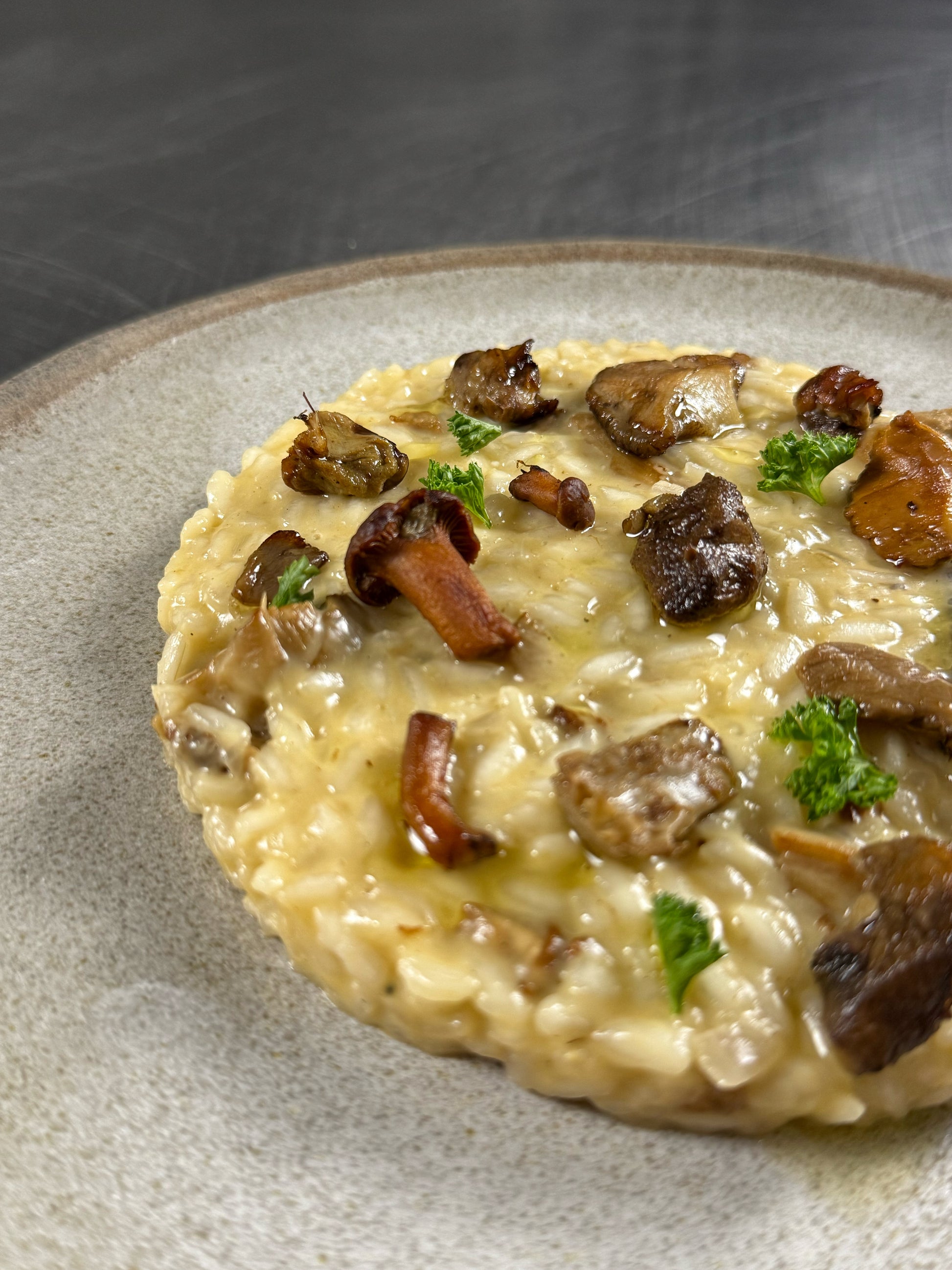 Pour le plat principal, laissez-vous tenter par un risotto crémeux d’exception, accompagné de champignons sauvages soigneusement sélectionnés : cèpes, pleurotes et girolles.